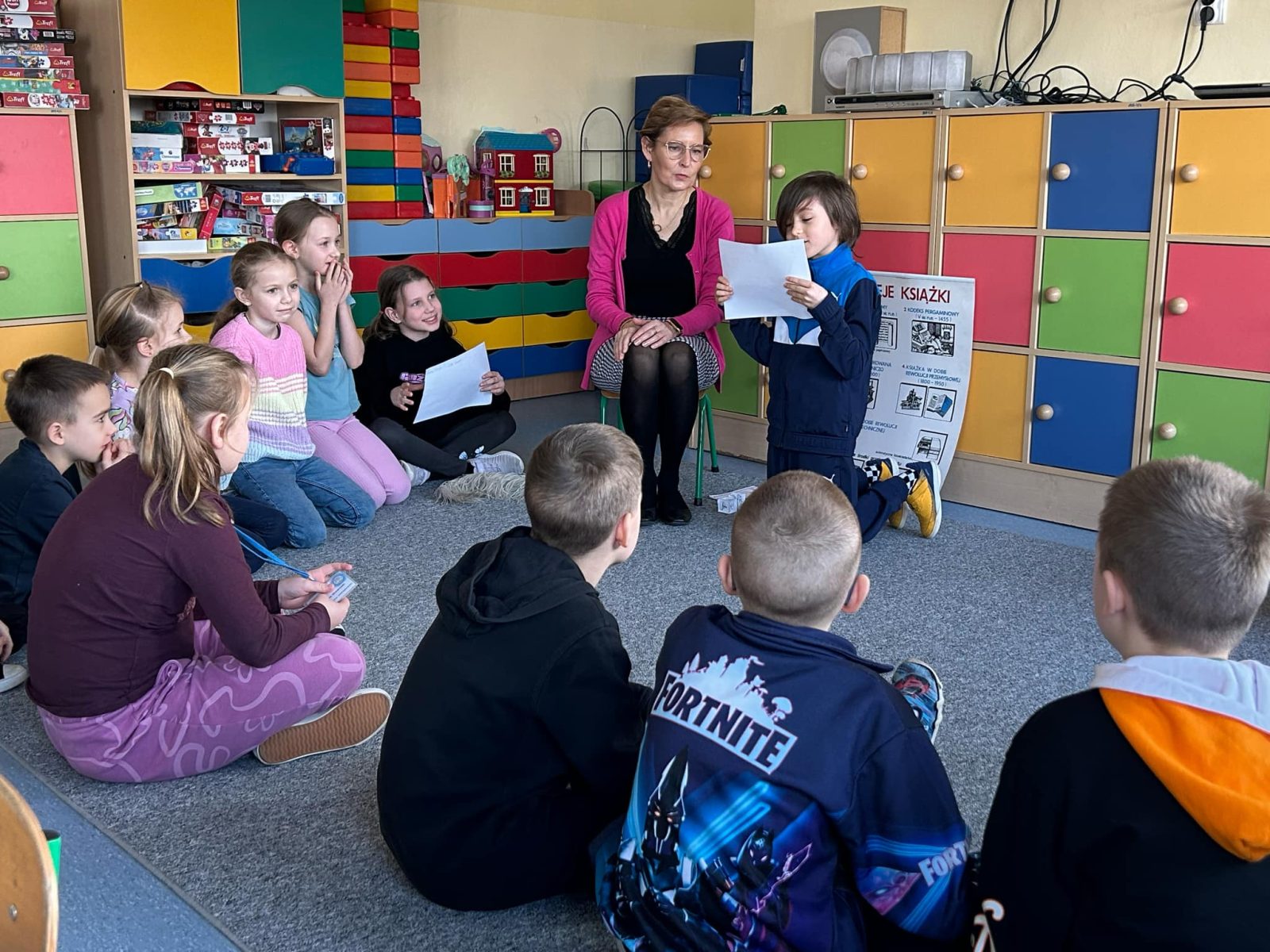 W związku z przypadającym 3 marca Dniem Pisarzy i Pisarek w świetlicy odbyły się zajęcia z udziałem pani bibliotekarki.  Uczniowie poznali historię powstawania pisma i książki oraz dowiedzieli się jak kiedyś wyglądała praca pisarza. Podsumowaniem zajęć było stworzenie przez dzieci własnego opowiadania przy pomocy kostki z obrazkami. Świetliczaki wykazały się niezwykłą kreatywnością w tworzeniu. Powstały ciekawe opowiadania, które zostały odczytane na forum grupy.