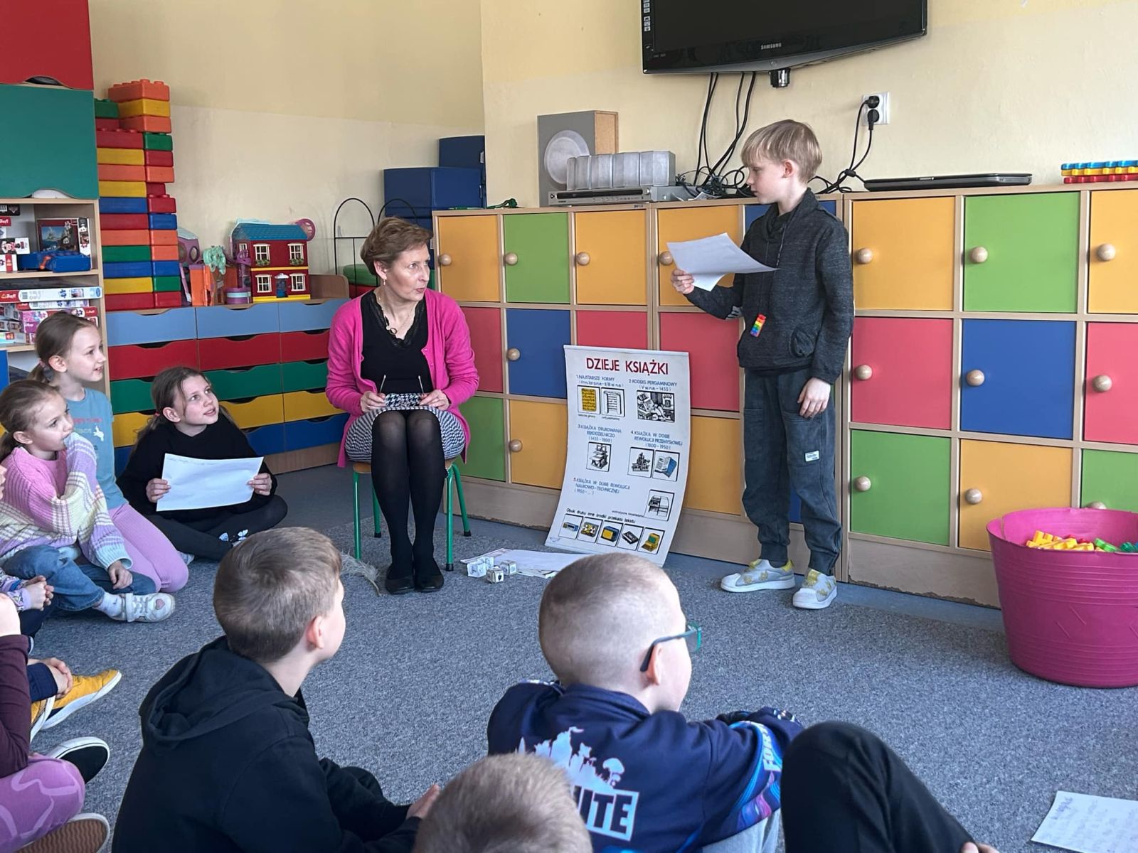 W związku z przypadającym 3 marca Dniem Pisarzy i Pisarek w świetlicy odbyły się zajęcia z udziałem pani bibliotekarki. Uczniowie poznali historię powstawania pisma i książki oraz dowiedzieli się jak kiedyś wyglądała praca pisarza. Podsumowaniem zajęć było stworzenie przez dzieci własnego opowiadania przy pomocy kostki z obrazkami. Świetliczaki wykazały się niezwykłą kreatywnością w tworzeniu. Powstały ciekawe opowiadania, które zostały odczytane na forum grupy.