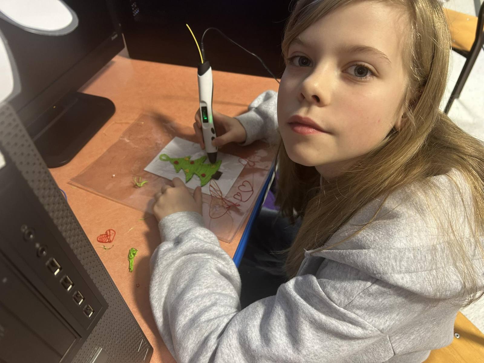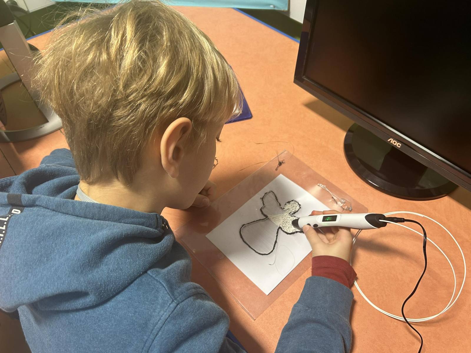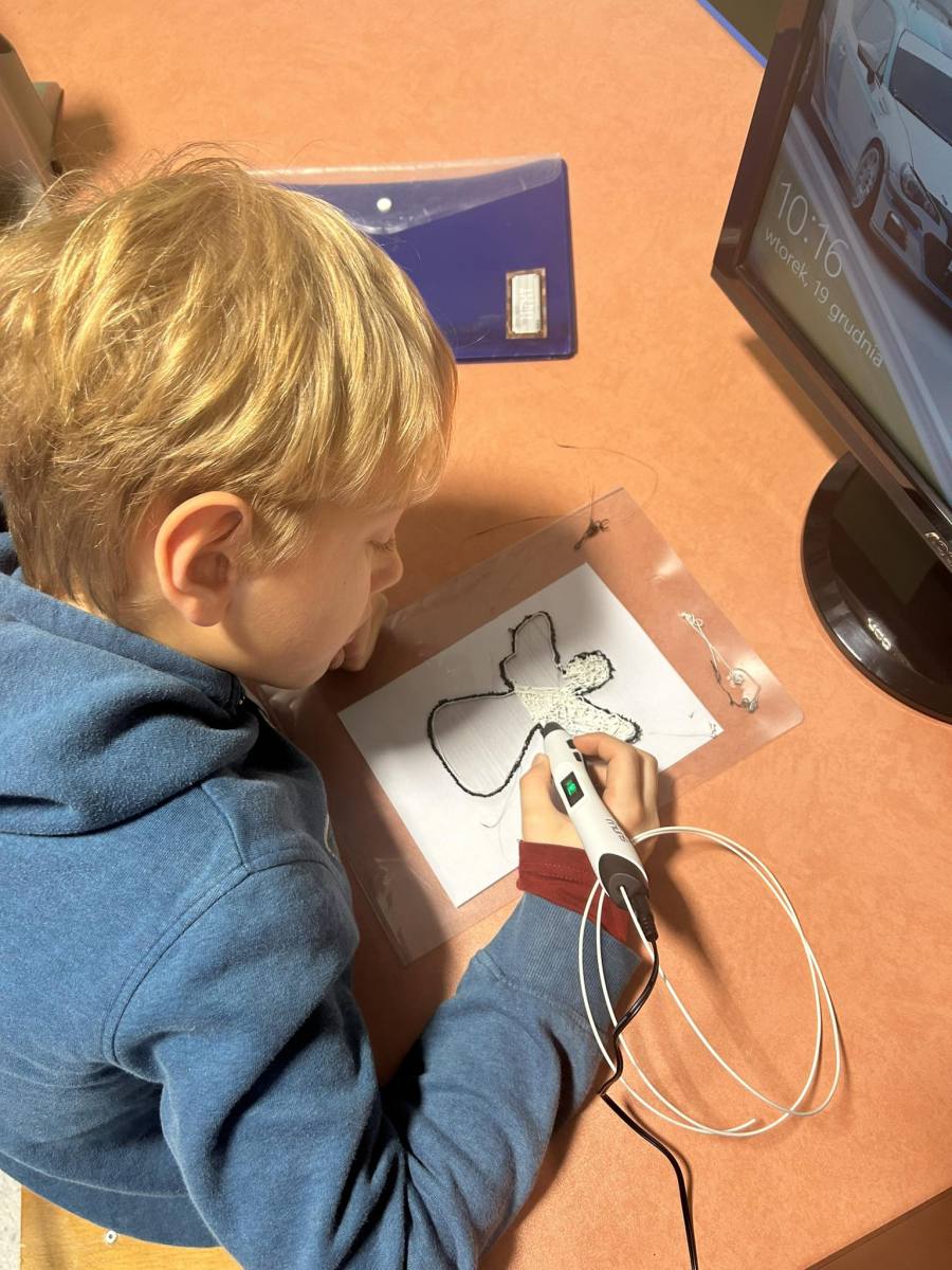 dowiedzieli się jak działają pióra 3D, jak je obsługiwać i jak z ich pomocą stworzyć ozdoby bożonarodzeniowe. Pióro 3D to mała ręczna drukarka 3D, która działa na zasadzie drukowania FDM/FFF. W tłumaczeniu oznacza to, że pióro topi plastikowy sznurek (tzw. filament), który można kształtować. Stopiony plastik szybko krzepnie na powietrzu i zachowuje swój kształt.