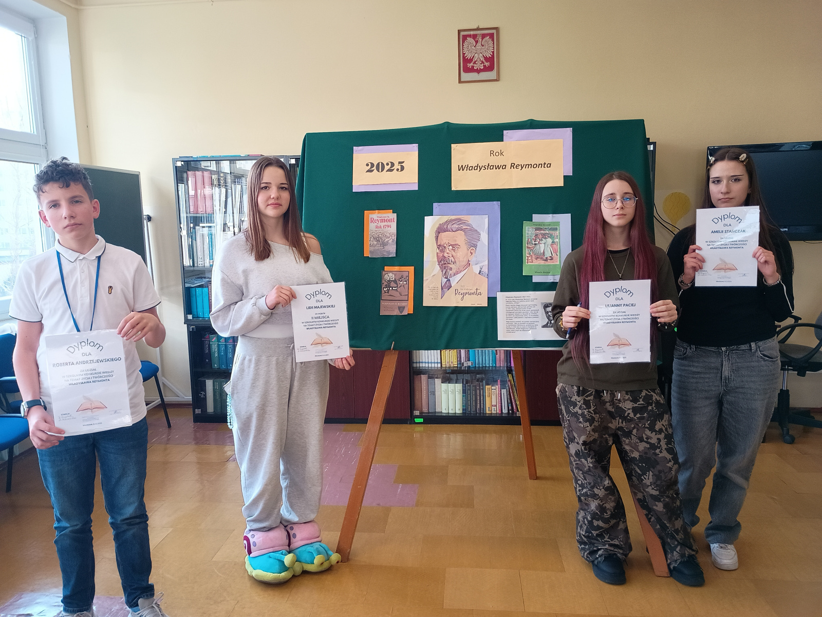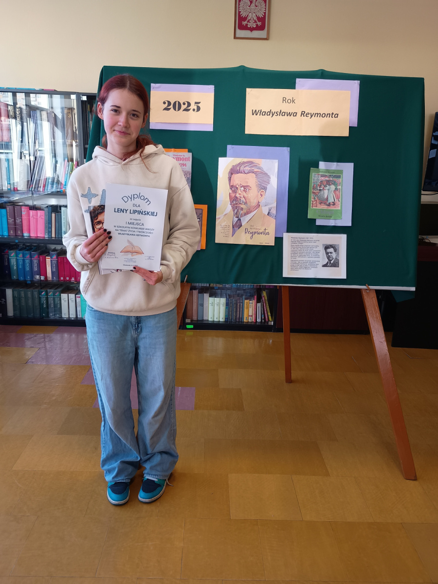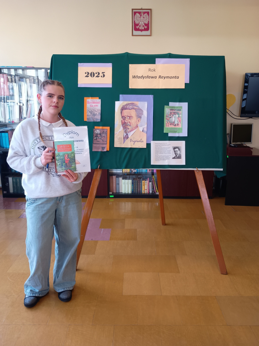 Na każdy rok Sejm i Senat Rzeczypospolitej Polskiej wybiera patronów, którym jest on poświęcony. Na rok 2025 przypada 100. rocznica śmierci Władysława Reymonta – jednego z najwybitniejszych polskich pisarzy, laureata Literackiej Nagrody Nobla. W związku z tym biblioteka szkolna ogłosiła dla chętnych uczniów klas ósmych naszej szkoły konkurs wiedzy pod hasłem ,, Władysław Reymont- patron 2025 roku”. Celem konkursu było zachęcenie uczniów do zapoznania się z życiem i twórczością tego wybitnego pisarza, popularyzowanie literatury polskiej a także promocja czytelnictwa. Zadanie konkursowe polegało na rozwiązaniu testu na podstawie materiałów przygotowanych przez bibliotekę szkolną. Tego zadania w dniu 8 grudnia podjęło się 9 ,,śmiałków” z klasy 8b, 8c, 8d i 8e. Ogłoszenie wyników konkursu miało miejsce 10 grudnia.