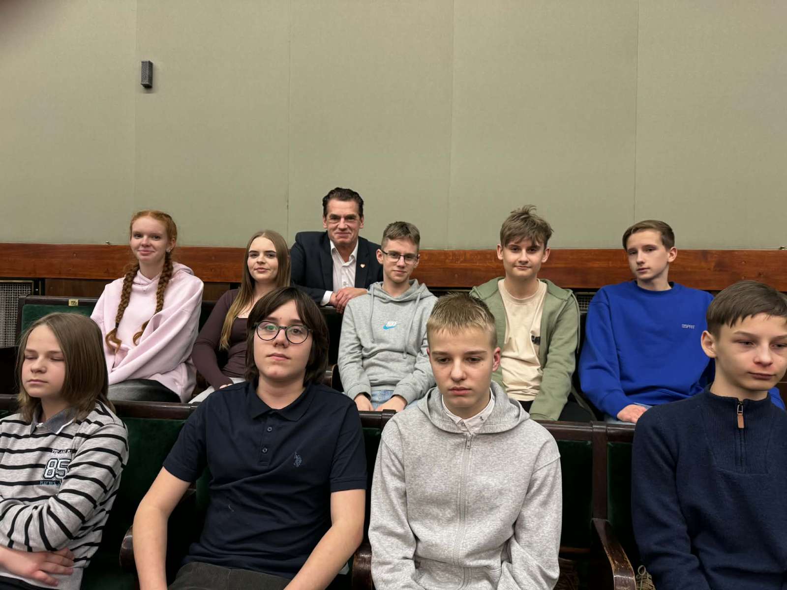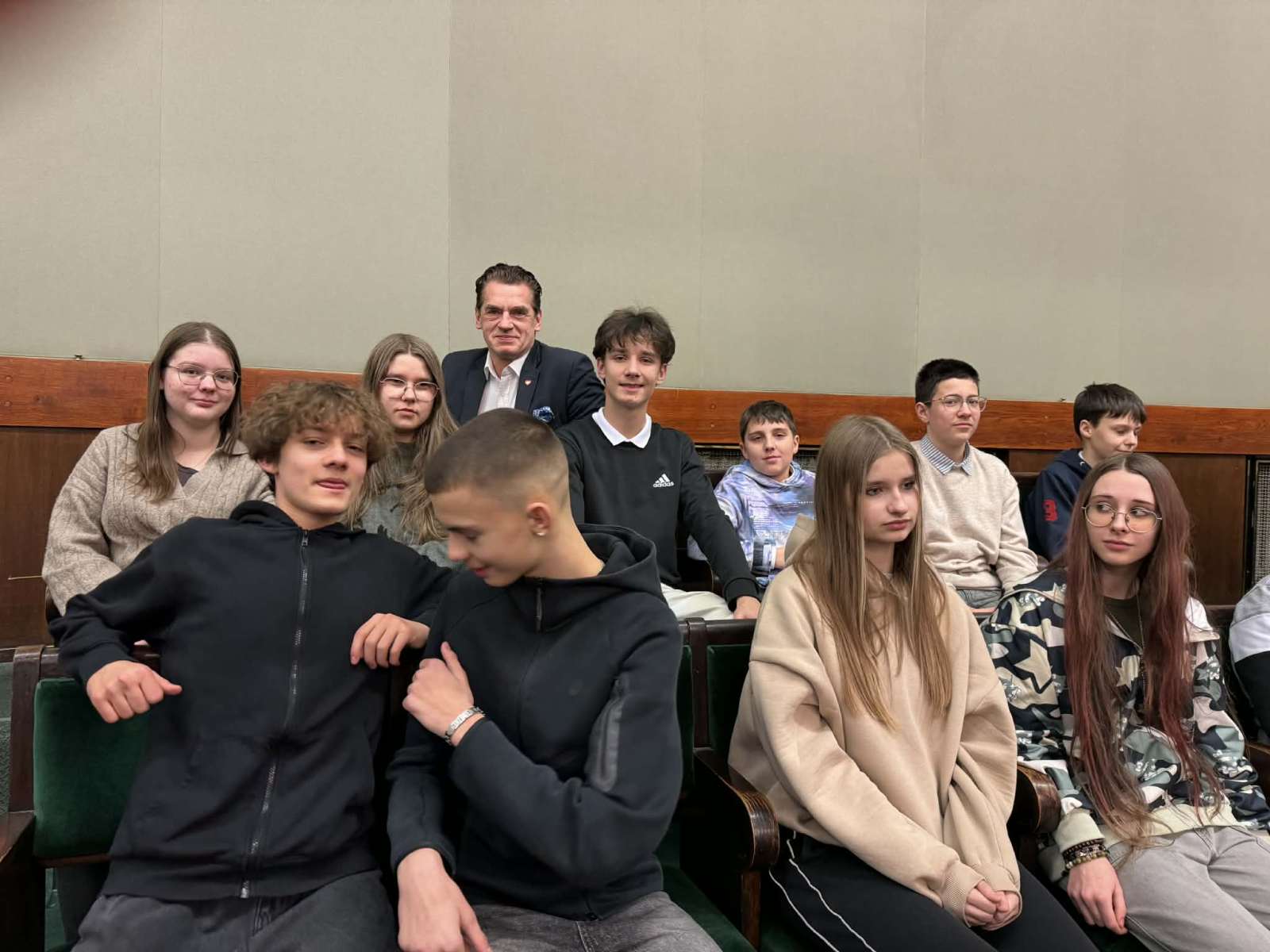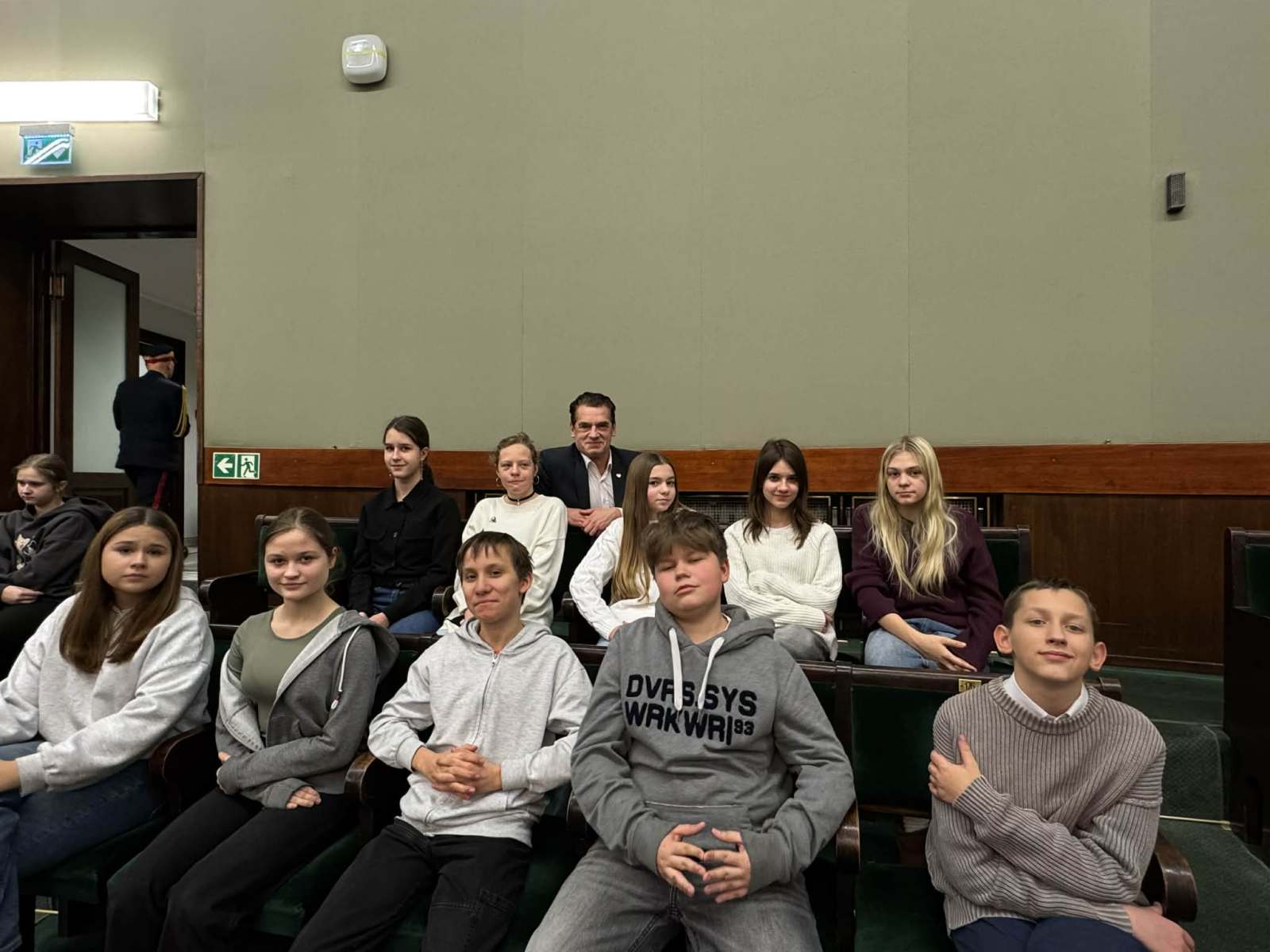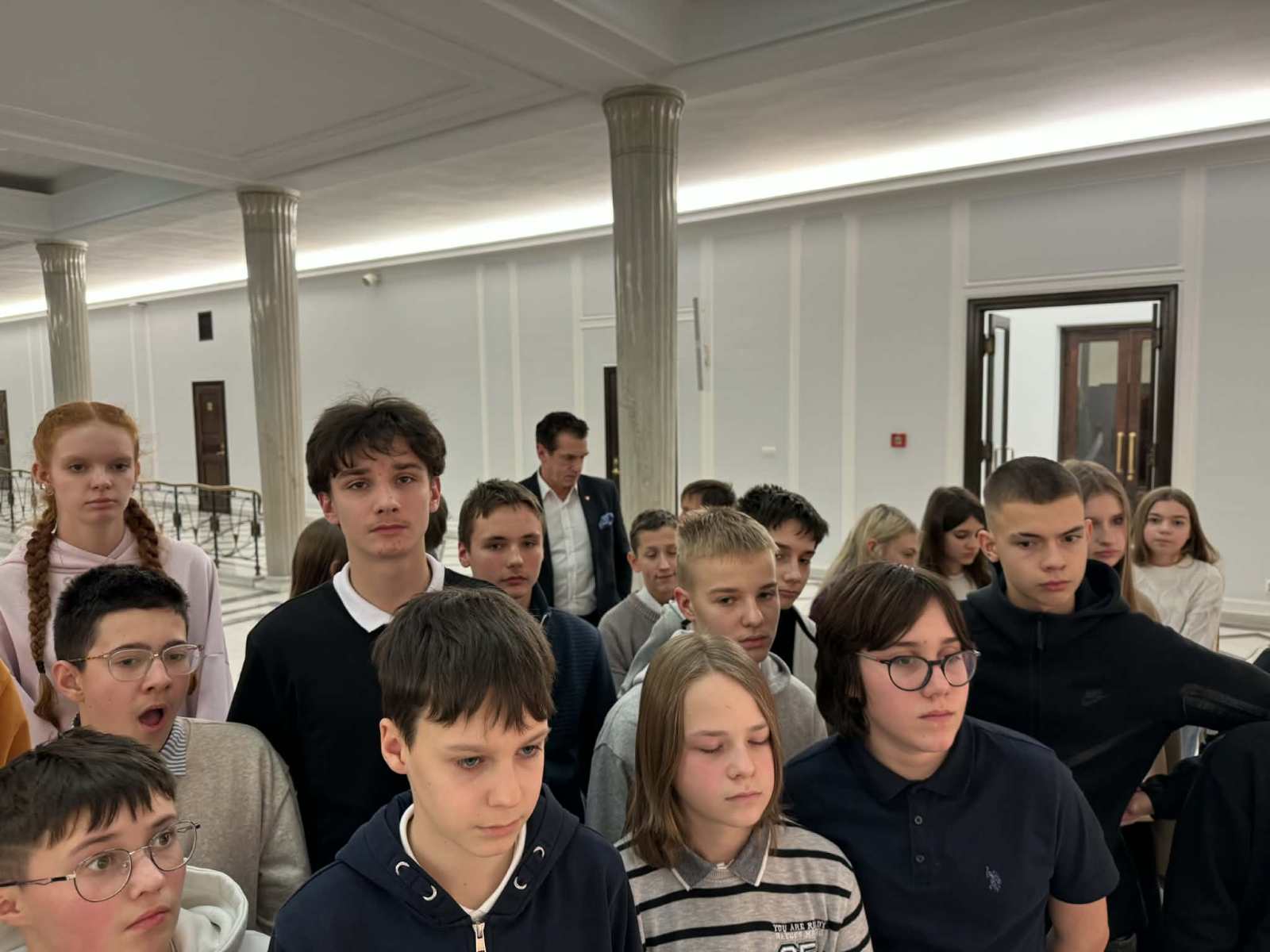 Wyjątkowym momentem wycieczki uczniów SP20 do Sejmu RP było oficjalne powitanie naszej grupy przez Marszałka Sejmu, Pana Szymona Hołownię, co było dla uczniów dużym wyróżnieniem i niezapomnianym przeżyciem.