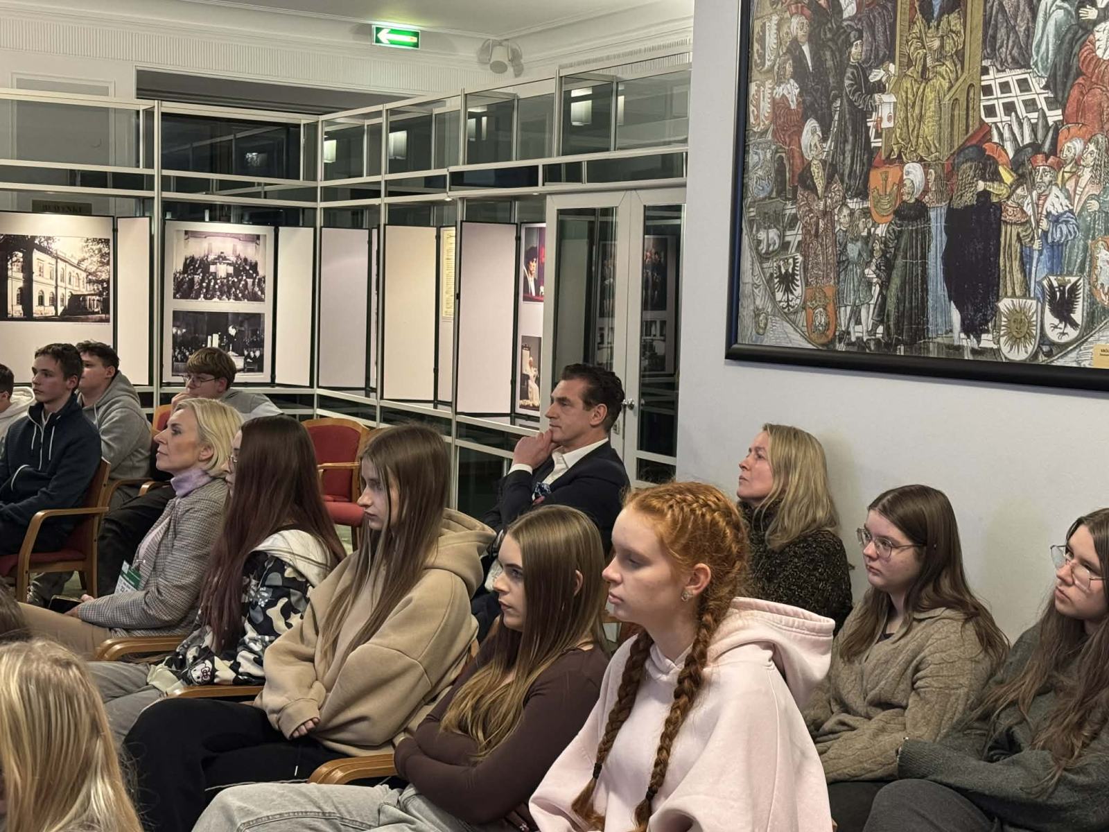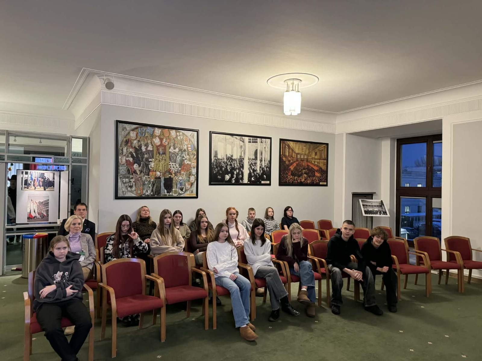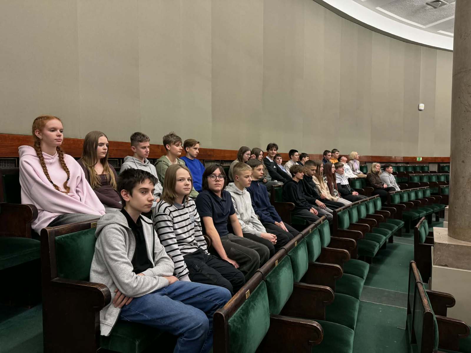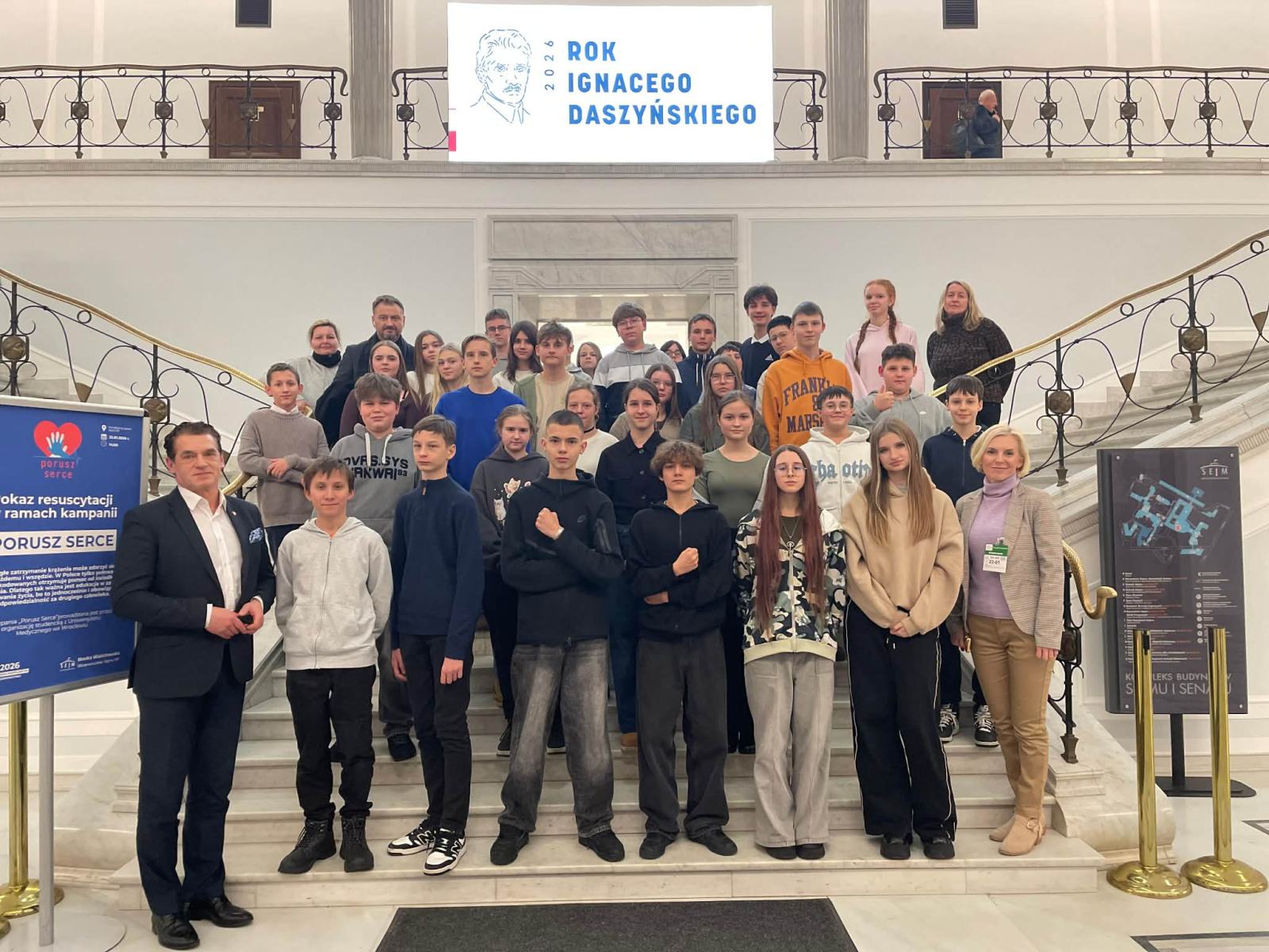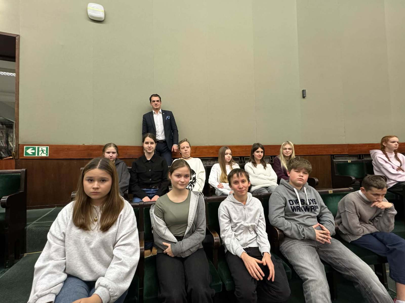 Wyjątkowym momentem wycieczki uczniów SP20 do Sejmu RP było oficjalne powitanie naszej grupy przez Marszałka Sejmu, Pana Szymona Hołownię, co było dla uczniów dużym wyróżnieniem i niezapomnianym przeżyciem.